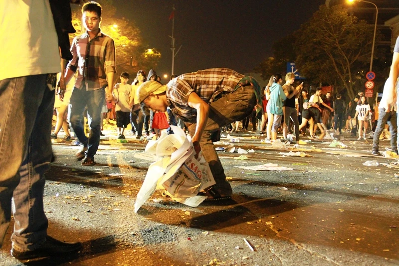 Lúc đó, một bạn trẻ tự giác thu dọn rác thải từ sự thiếu ý thức của người dân.