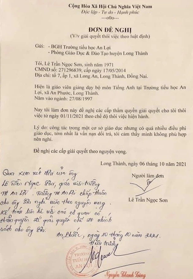 Ngày 11-10, giáo viên Lê Trần Ngọc Sơn dạy môn tiếng Anh tại trường tiểu học An Lợi (xã An Phước, huyện Long Thành, tỉnh Đồng Nai) cho biết đã nộp đơn đề nghị giải quyết thôi việc gửi Ban Giám hiệu Trường tiểu học An Lợi và Phòng GD&ĐT huyện Long Thành.