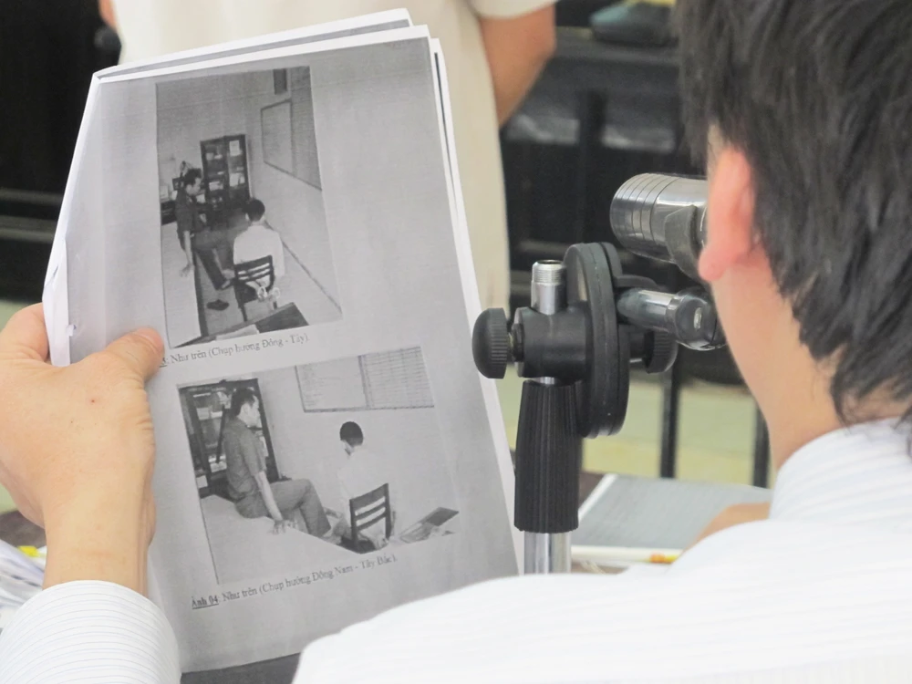 Các luật sư bào chữa cho cho bị cáo Nguyễn Thân Thảo Thành là Nguyễn Văn Thắng, Lê Ngọc Hoàng trưng ra một số hình ảnh mà cơ quan điều tra đã thực nghiệm về vị trí ngồi của anh Ngô Thanh Kiều trong quá trình xét hỏi tại Công an TP Tuy Hòa sáng 13-5-2012.
