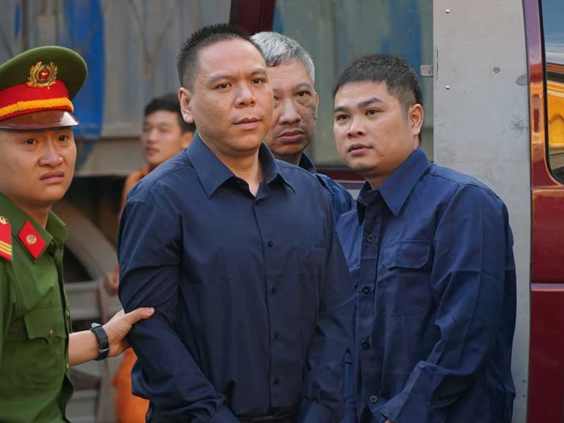 Bị cáo Mai Hữu Khương (trái) bị dẫn giải về trại tạm giam. Ảnh: QUỐC VŨ
