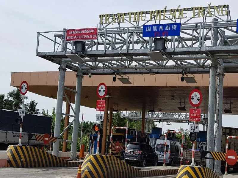 Trạm thu giá BOT Sóc Trăng trên tuyến quốc lộ 1A đã cắm biển "Cấm dừng xe quá 5 phút".