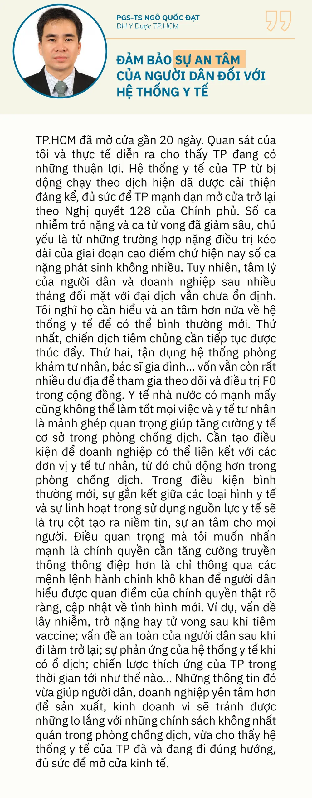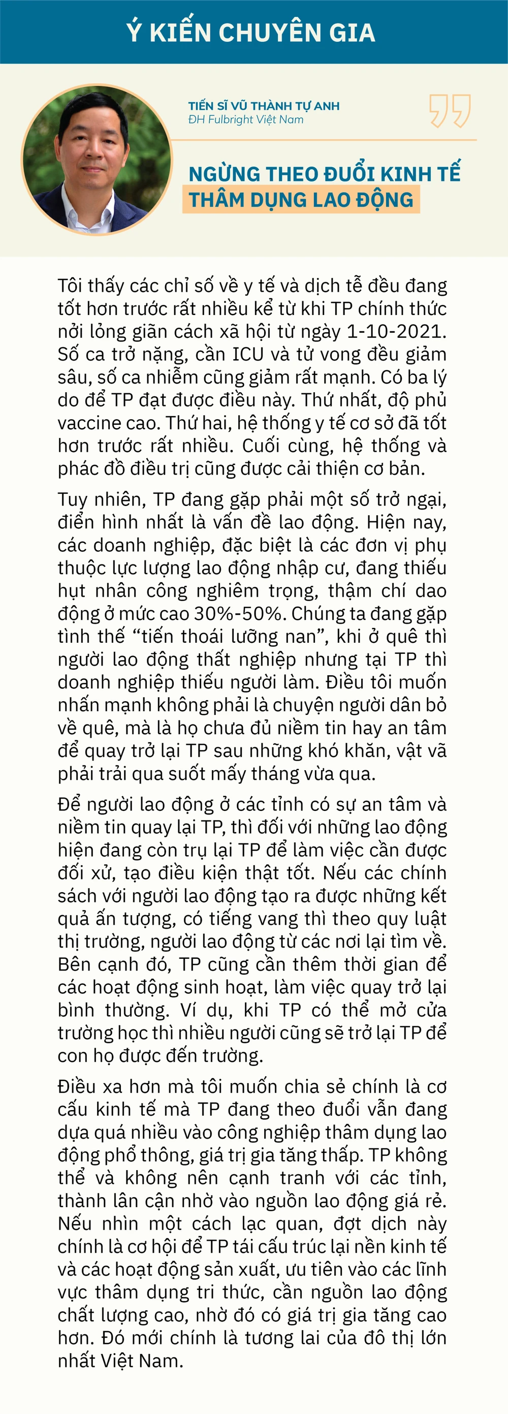 + TS Trương Minh Huy Vũ: Tôi cho rằng TP chỉ vừa bước qua giai đoạn khó khăn nhất trong phòng chống dịch COVID-19, vì vậy “sức khỏe” của nền kinh tế còn rất yếu và đang trong giai đoạn hồi sức.