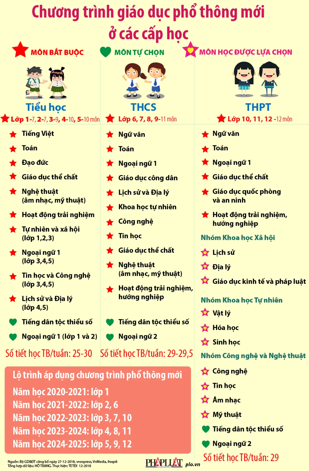 (PLO)- Chiều 27-12-2018, Bộ GD&ĐT chính thức công bố chương trình giáo dục phổ thông mới với số tiết học trung bình/tuần từ 25-30 tiết. Cụ thể theo ba khối lớp như sau: