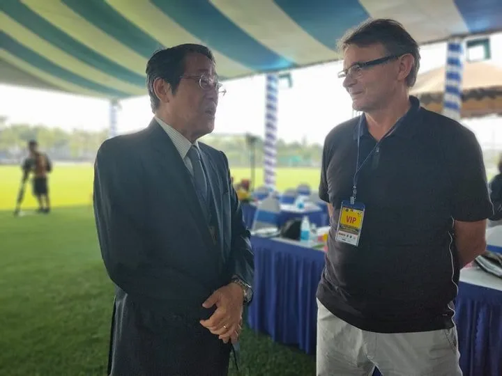 Giám đốc kỹ thuật kiêm HLV trưởng U-19 Việt Nam Philippe Troussier (phải) trò chuyện cùng Đại sứ Nhật Bản Umeda Konio.