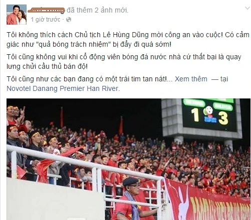 Nói về tình. Bóng đá là cái nghiệp và niềm đam mê của họ. Họ thi đấu dưới sân. Vì hàng triệu trái tim người hâm mộ Việt Nam. Chiến đấu vì màu cờ sắc áo như những người lính. Chiến đấu vì gia đình, con cái họ (bởi thua thì cũng kha khá người lôi gia đình họ ra chửi!). Đã làm cầu thủ. Ai không có tự ái nghề nghiệp? Ai cũng muốn chinh phục những danh hiệu, ai cũng muốn chiến thắng những giải đấu quan trọng thế này. Nhưng ĐT Brazil đôi khi còn thua đau. Nên đừng bắt chúng ta bất khả chiến bại. Họ cũng muốn chiến thắng và khao khát hơn bất kì ai. Tôi khẳng định: chúng tôi không ngại nắng nôi mưa gió luyện tập vất vả, không ngại những chấn thương rình rập. Không ngại những va chạm đổ máu trên sân. Kiếm được đồng tiền từ nghề này, không chỉ đổ mồ hôi mà còn phải đổ cả máu. Vì vậy, việc quy chụp bán độ cho đội tuyển đừng nói ra để cho vui và tỏ ra nguy hiểm. Nó ảnh hưởng đến danh dự trực tiếp của cầu thủ và những người thân của họ. Bán độ là phản bội Tổ quốc. Tổ quốc cho chúng tôi cuộc sống ấm no, Tổ quốc cho chúng tôi niềm vui được chơi bóng. Nên xin đừng “chụp mũ” và làm danh dự những người lính dũng cảm trở thành kẻ tội đồ”.