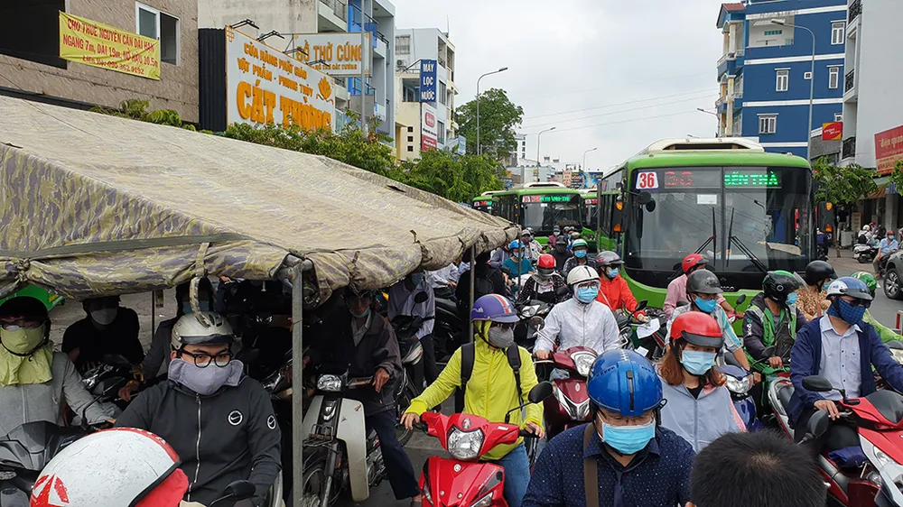 Ghi nhận, từ khoảng 5 giờ 30 phút sáng, hàng ngàn người dân điều khiển phương tiện rời khỏi nơi ở tại Gò Vấp để đến công ty, nơi làm việc ngoài địa bàn quận Gò Vấp. Ảnh NT