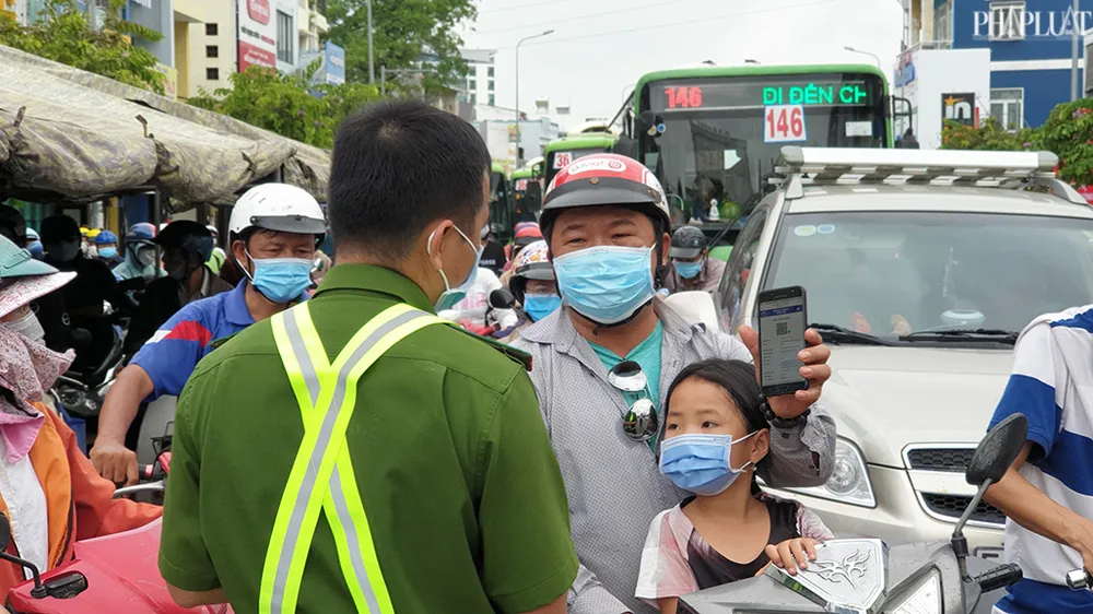 Khoảng 7 giờ sáng cùng ngày, tại chốt kiểm soát trên đường Quang Trung - cửa ngõ ra vào quận Gò Vấp, lượng xe cộ không tập trung quá đông. Lực lượng chức năng cũng tập trung kiểm tra giấy tờ tất cả những người có nhu cầu ra vào qua trạm. Ảnh NT