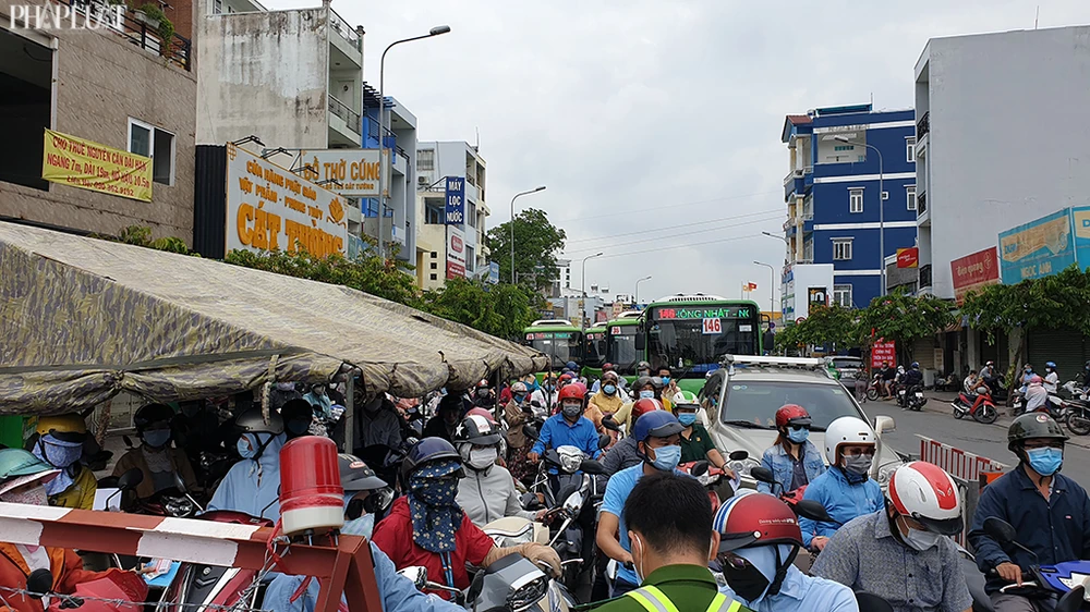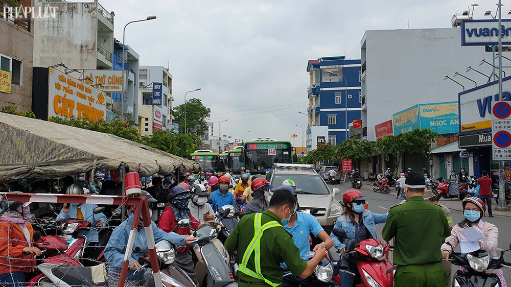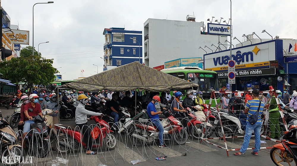 Việc phải xếp hàng dài trước các trạm kiểm soát khiến người dân mệt mỏi. Ngoài ra, số lượng người ùn tắc tại các chốt quá đông cũng gây mất an toàn phòng chống dịch bệnh trong điều kiện giãn cách xã hội theo chỉ thị 16 tại Gò Vấp. Ảnh NT