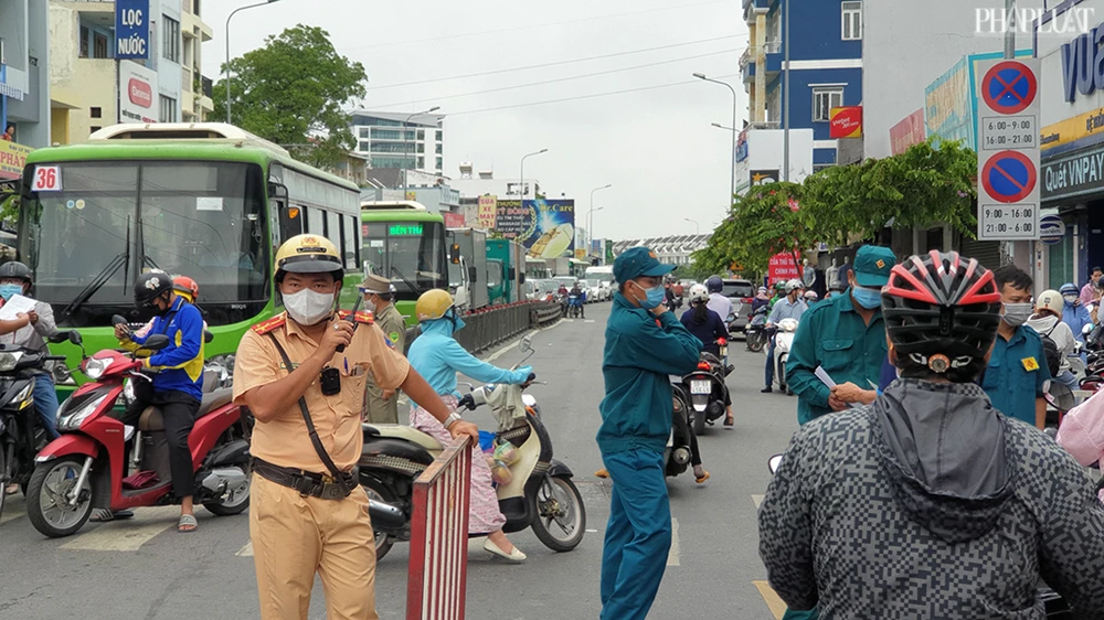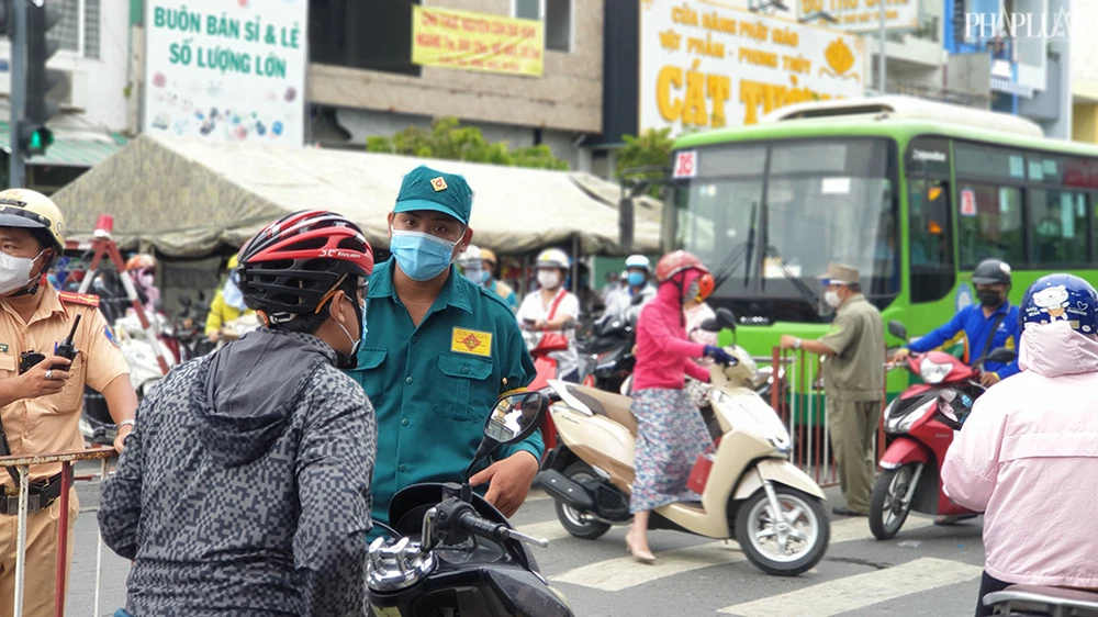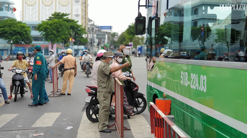 Tại các chốt kiểm soát, lực lượng chức năng chốt chặn, kiểm tra người dân qua trạm ở cả hai chiều ra và vào quận Gò Vấp. Ảnh NT