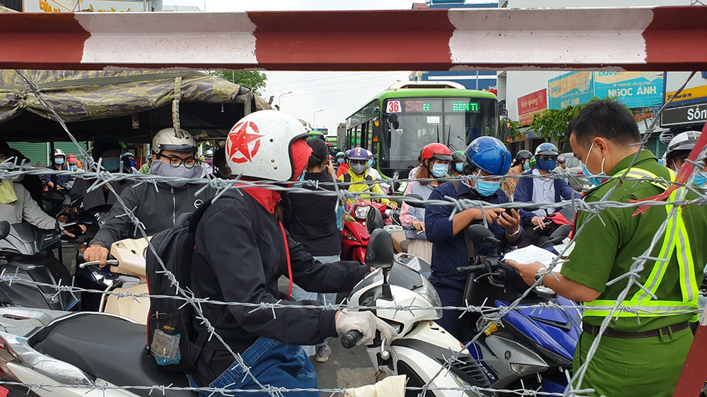 Lực lượng chức năng kiểm soát, chốt chặn ở các cửa ngõ ra vào quận Gò Vấp để kiểm tra giấy tờ. Ảnh NT