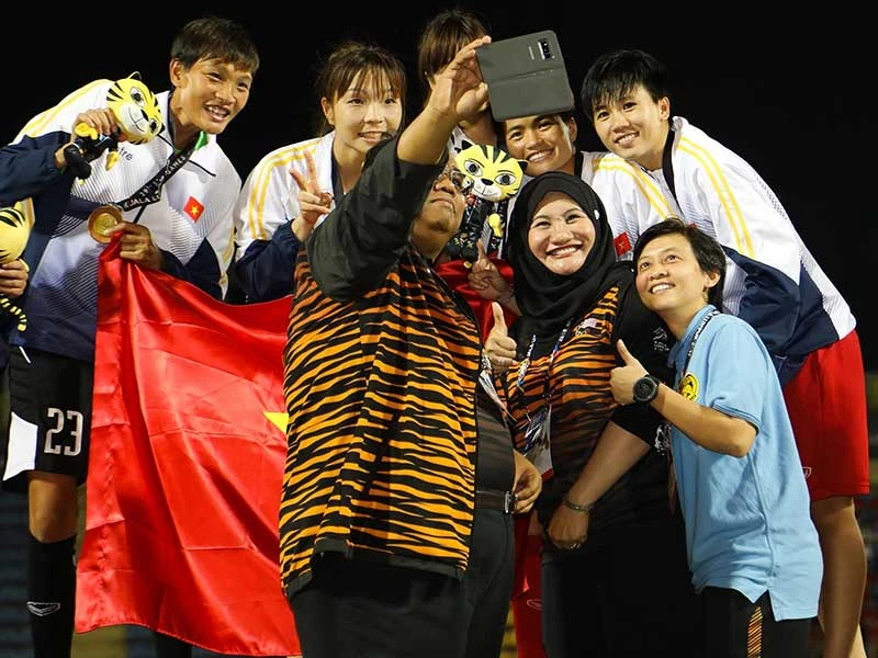 Dù Malaysia bị các cô gái Việt Nam hạ đến 6-0 nhưng người Malaysia vẫn thán phục, xin chụp ảnh với các cô gái vàng. Ảnh: HUY PHẠM