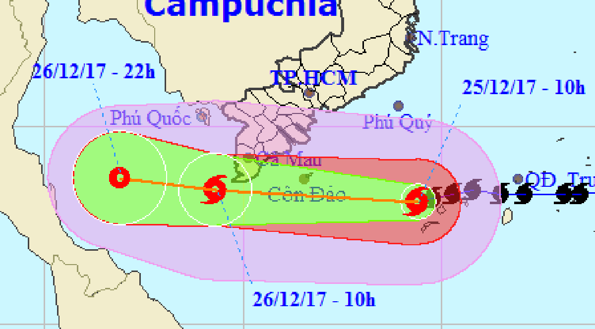 Từ trưa 25-12, vùng biển các tỉnh từ Bà Rịa-Vũng Tàu đến Cà Mau (bao gồm cả Côn Đảo) có gió mạnh dần lên cấp 8, sau tăng lên cấp 9, giật cấp 12; sóng biển cao 6-8 m.