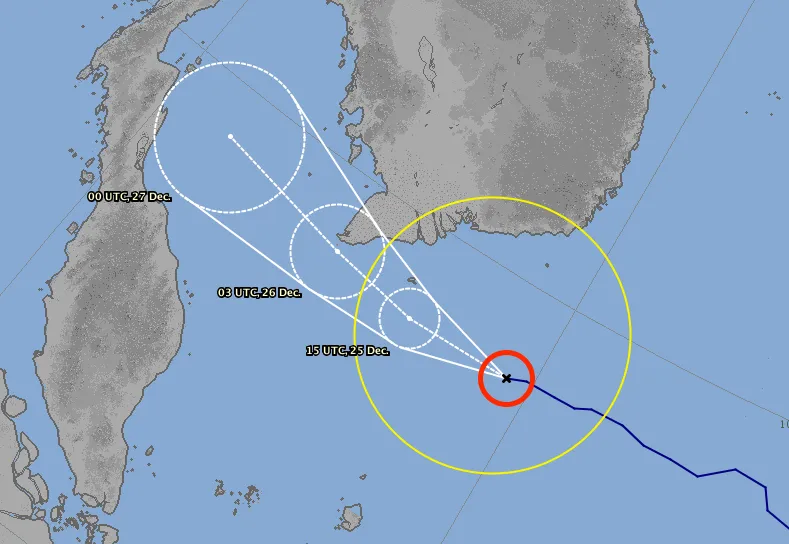 Trước đó, theo dự báo của JMA, tính đến 3 giờ ngày 25-12 (theo giờ Hợp tác quốc tế UTC, tức 10 giờ sáng 25-12 theo giờ Việt Nam), bão Tembin tiếp tục di chuyển về hướng Tây với tốc độ 20 km/giờ. Khu vực gần tâm bão có tốc độ gió tối đa là khoảng 120 km/giờ, trong khi tốc độ gió cực đại sẽ vào khoảng 175 km/giờ.