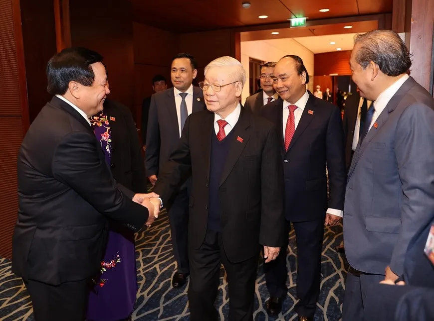 Tại Hội trường lớn, Trung tâm Hội nghị quốc gia Mỹ Đình (Hà Nội), nơi sẽ diễn ra các phiên họp toàn thể Đại hội XIII của Đảng, Tổng Bí thư, Chủ tịch nước Nguyễn Phú Trọng tươi cười, bắt tay các Ủy viên Bộ Chính trị, Thủ tướng Chính phủ Nguyễn Xuân Phúc; Ủy viên Bộ Chính trị, Chủ tịch Quốc hội Nguyễn Thị Kim Ngân.