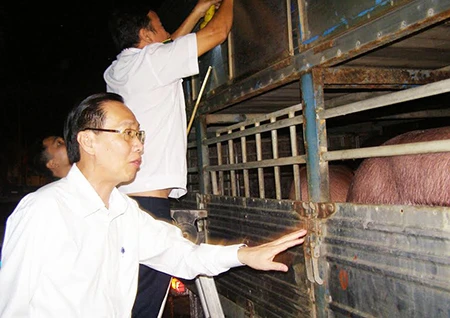 Gần 19 giờ, vị Phó Chủ tịch UBND TP.HCM có mặt tại Trạm Kiểm dịch động vật An Lạc (huyện Bình Chánh). Một xe chở 70 con heo từ Long An ghé vào trạm để phúc kiểm, Phó Chủ tịch liền đi tới tìm hiểu quy trình kiểm dịch của nhân viên trạm. Thấy một người dùng cây khua dưới sàn xe để heo đứng lên, vị Phó Chủ tịch thắc mắc. Ông Phan Xuân Thảo, Chi cục trưởng Chi cục Thú y TP.HCM, giải thích: “Thưa anh, khua để heo đứng lên nhằm phát hiện heo có bị bơm nước và bị cho uống thuốc an thần không. Nếu heo nằm lì dưới sản là nguy cơ bị bơm nước và cho uống thuốc an thần rất cao, nhân viên của trạm sẽ kiểm tra lại để xử lý”. “Ừ, các em kiểm tra kỹ như vậy là tốt. Đừng để heo bơm nước xuất hiện ở TP.HCM, anh hưởng sức khỏe bà con” – vị Phó Chủ tịch dặn dò.