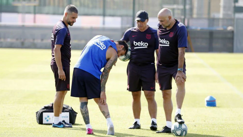 Barcelona tập theo từng nhóm nhỏ cầu thủ để phòng ngừa lây nhiễm. Ảnh: TS