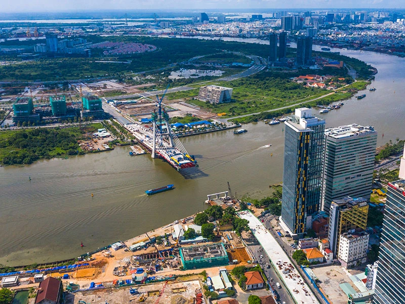 Dự án cầu Thủ Thiêm 2 kết nối khu đô thị mới Thủ Thiêm (quận 2) với khu trung tâm TP.HCM đang trong quá trình thi công. Ảnh: HOÀNG GIANG