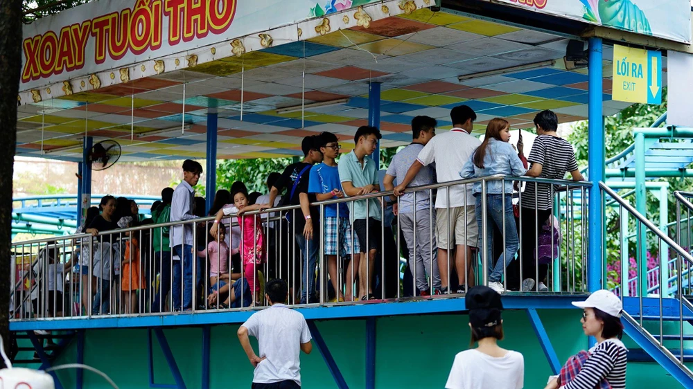 Từ hôm qua đến nay, từ sáng sớm công viên văn hóa Đầm Sen (quận 11) đã chào đón hàng trăm lượt du khách. Các khu vực bán vé trở nên quá tải. Càng về trưa, thời tiết càng nóng, lượng khách đổ về càng đông hơn. Những khu vực trò chơi miễn phí ngoài trời thu hút rất nhiều em nhỏ.
