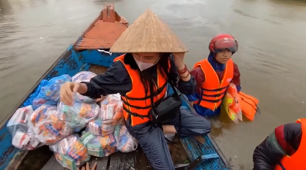 Hòa Minzy cùng quản lý trao quà gồm áo phao cứu hộ, đồ ăn, nước suối cho bà con vùng lũ ở Quảng Bình, Hà Tĩnh từ 19-10.