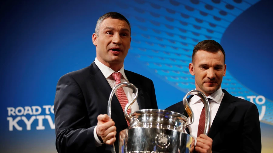 Thị trưởng V. Klitchko của Kiev cùng cựu QBV châu Âu Shevchenko trong sự kiện chung kết Champions League 2017-2018