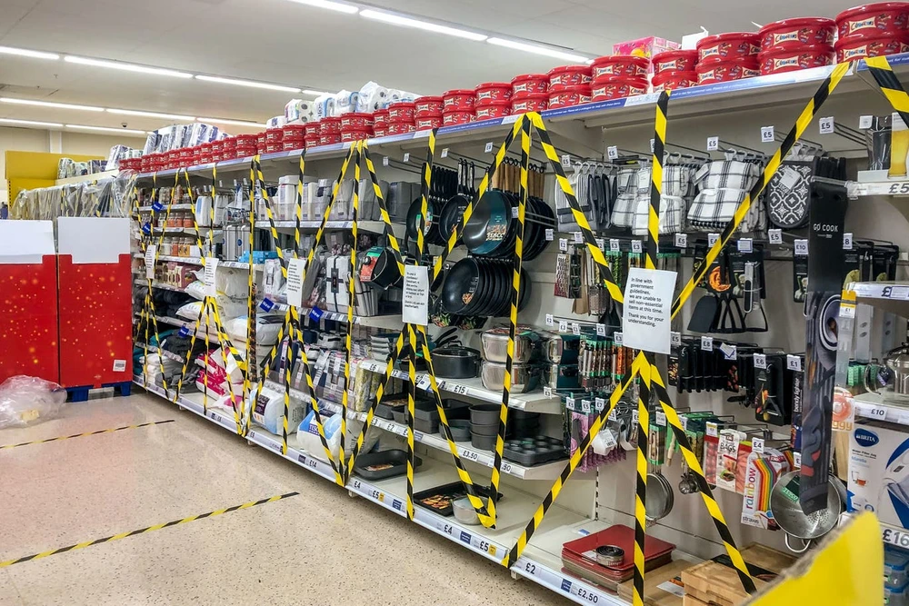 Một siêu thị tại xứ Wales đánh dấu các gian hàng hàng hóa không thiết yếu. Ảnh: PA