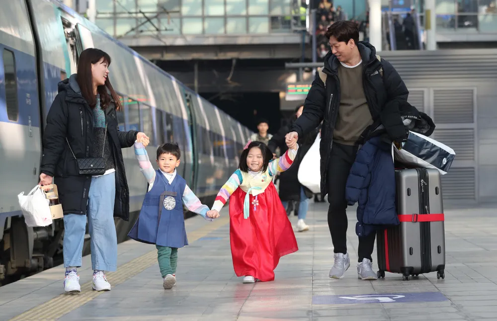 Hai em bé Hàn Quốc mặc trang phục truyền thống có mặt tại nhà ga Seoul cùng gia đình để lên tàu về quê đón tết. Ảnh: YONHAP