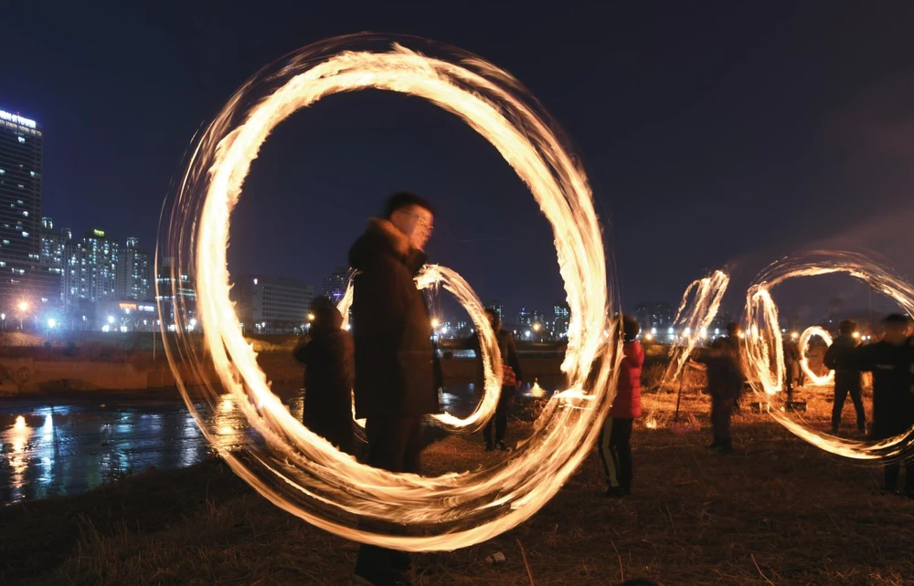 Một người đàn ông thực hiện nghi lễ truyền thống, xoay tròn một khối than đang cháy trong lễ Jeongwol Daeboreum. Ảnh: CNN