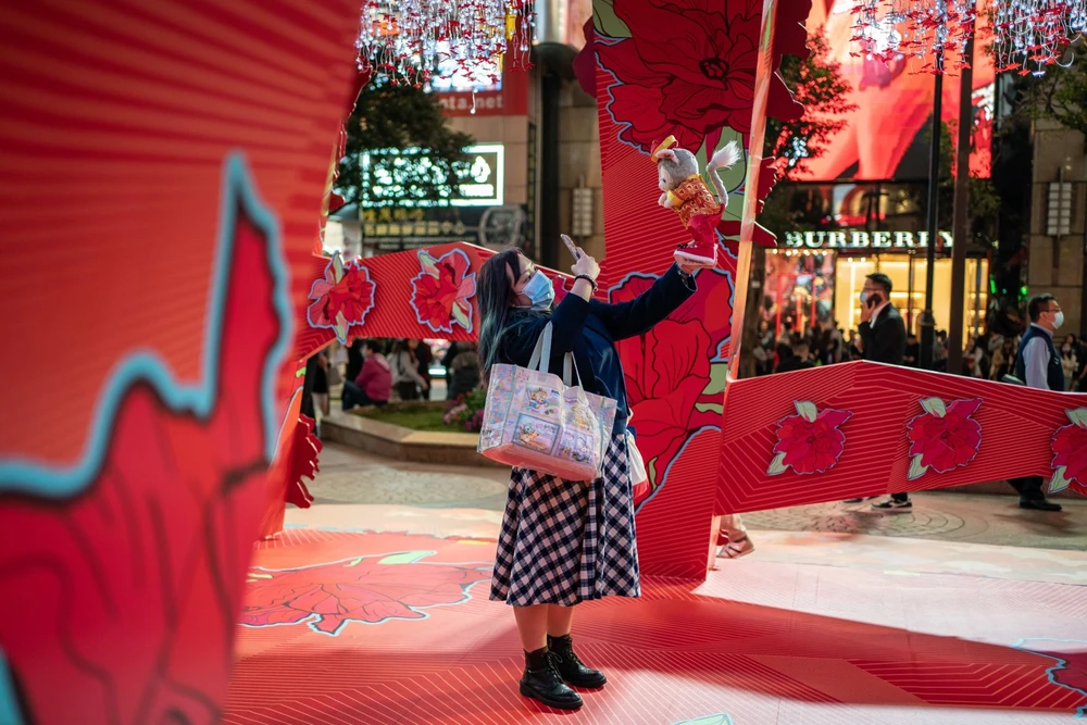 Một cô gái chụp ảnh trước một trung tâm mua sắm ở Hong Kong. Ảnh: CNN