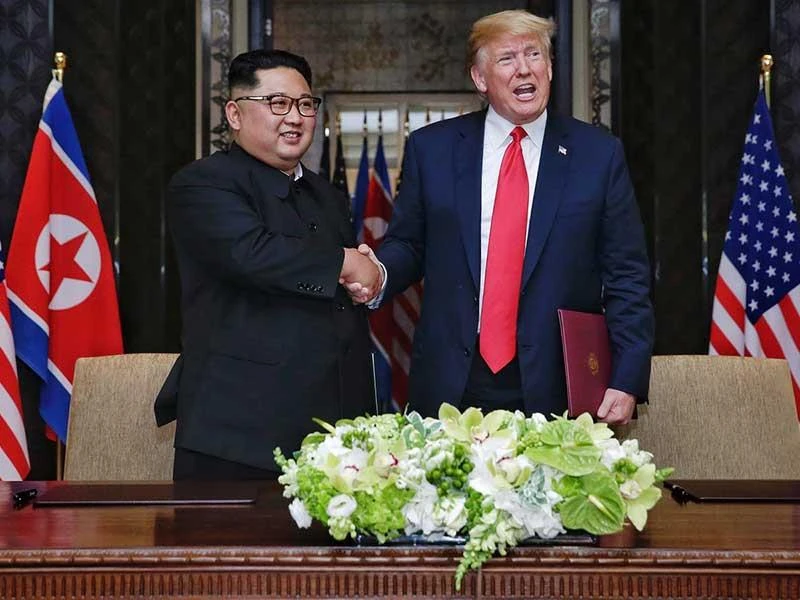 Tổng thống Mỹ Donald Trump và Chủ tịch CHDCND Triều Tiên Kim Jong-un tại hội nghị thượng đỉnh lần thứ nhất ở Singapore vào tháng 6-2018. Ảnh: THE WASHINGTON POST