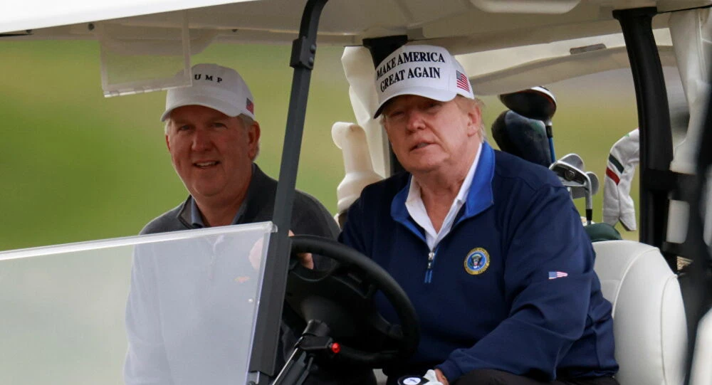 Tổng thống Mỹ Donald Trump ngồi trên xe trong một buổi chơi golf. Ảnh: SPUTNIK