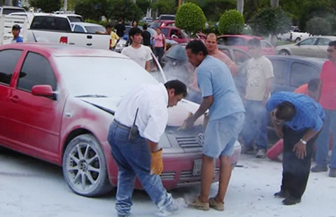 Một chiếc xe được dập tắt sau đám hỏa hoạn. Ảnh: HIDDENCANCUN