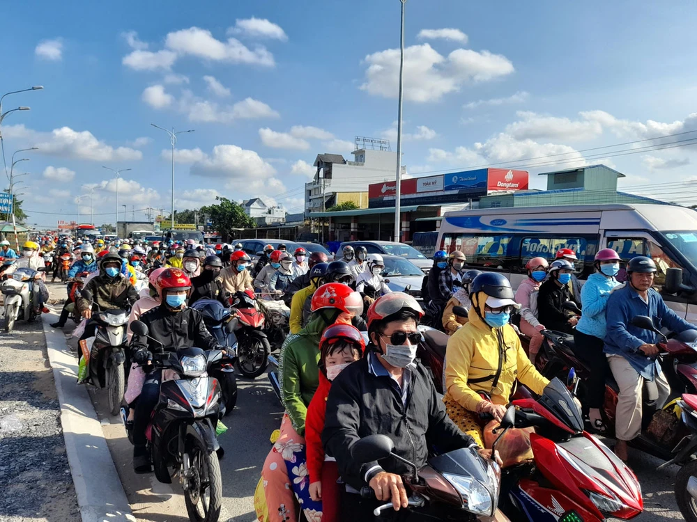 Ùn ứ tại đường dẫn vào cầu Rạch Miễu chiều 2-5. Ảnh: ĐÔNG HÀ