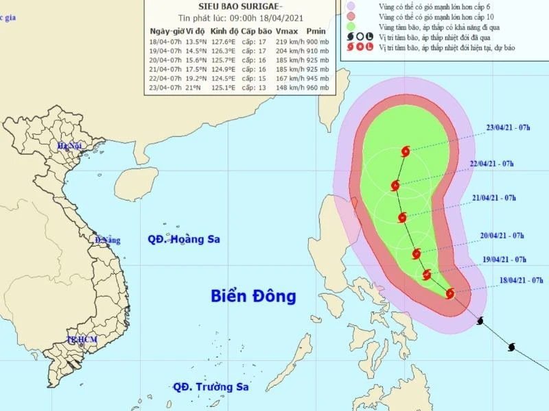 Sơ đồ dự báo vị trí và đường đi của siêu bão Surigae. Ảnh: KTTVQG