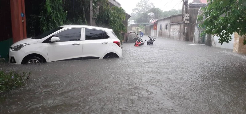 Mưa lớn gây ngập sâu ở khối Đông Lâm, phường Hưng Dũng, TP Vinh sáng 16-10. Ảnh: ĐẮC LAM
