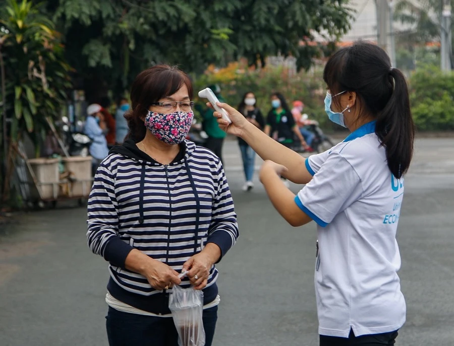 Trường ĐH Kinh tế Luật kiểm tra thân nhiệt cho người ra vào trường trong các đợt dịch COVID-19. Ảnh: NT