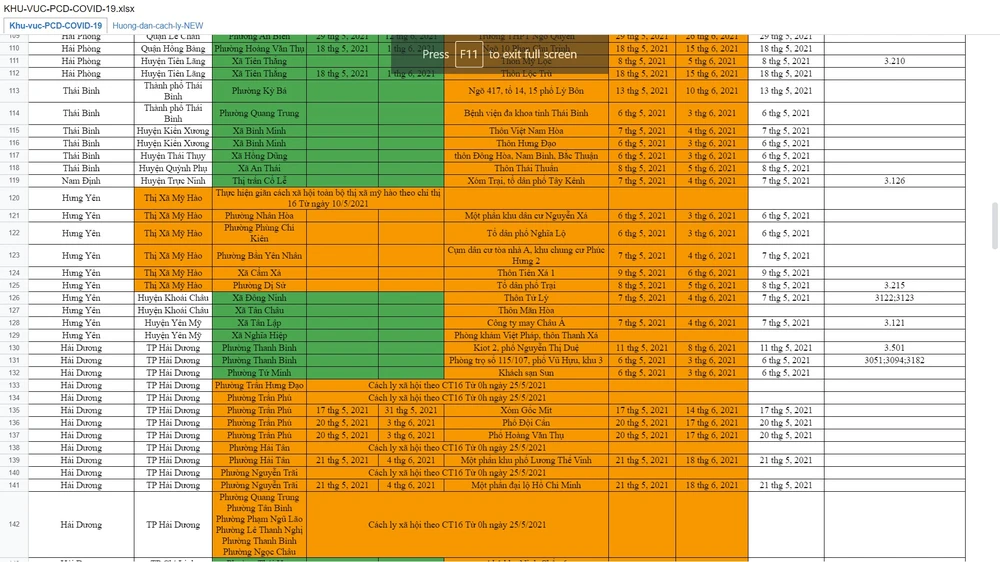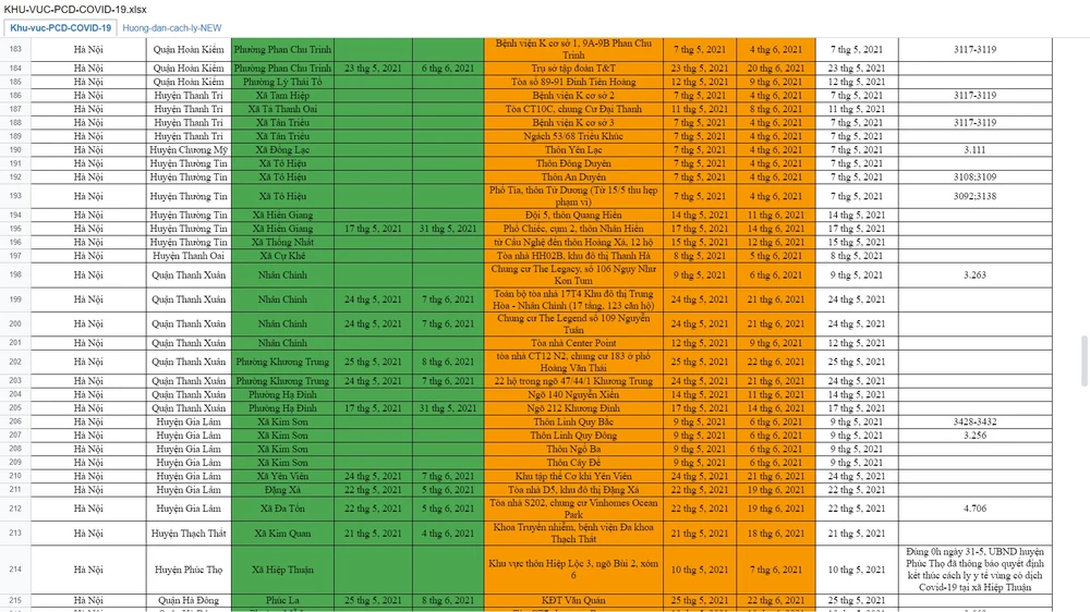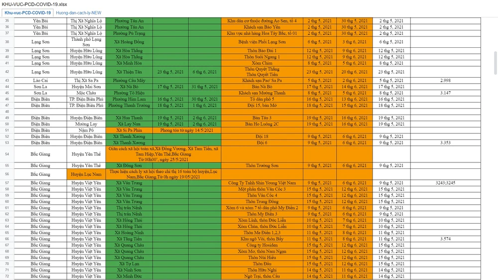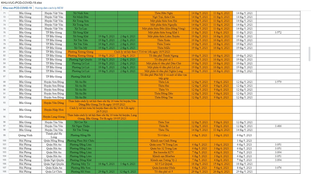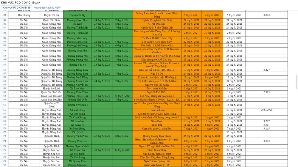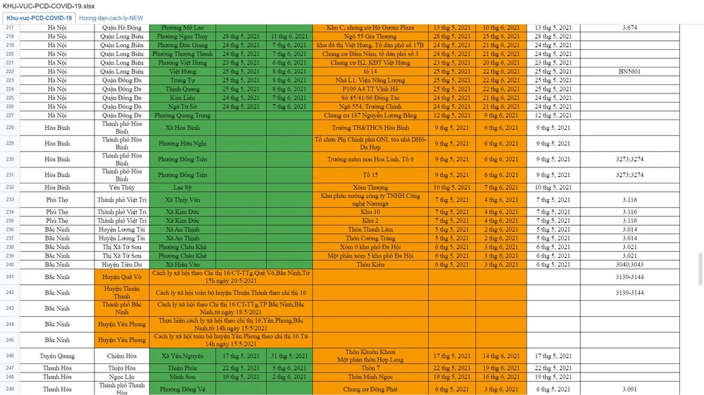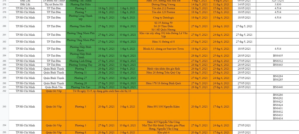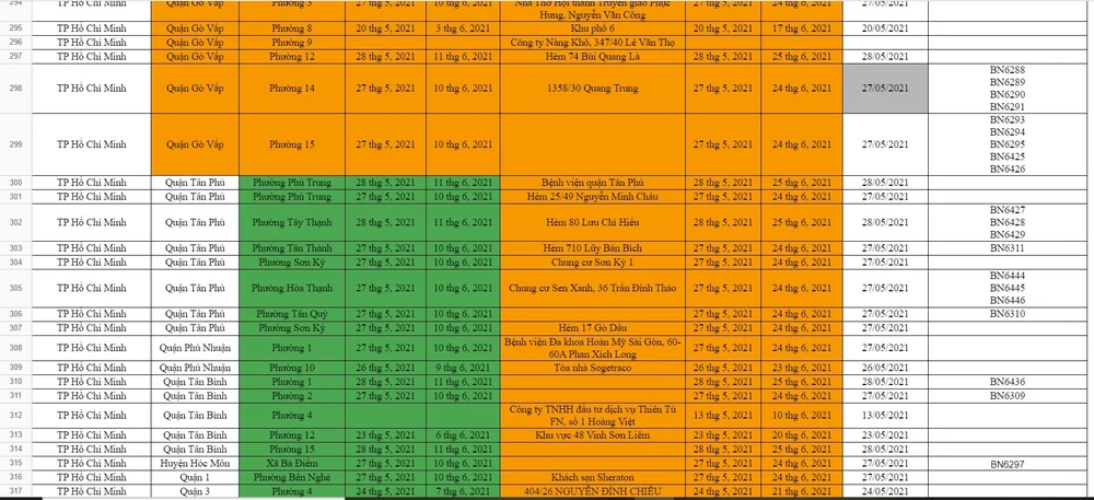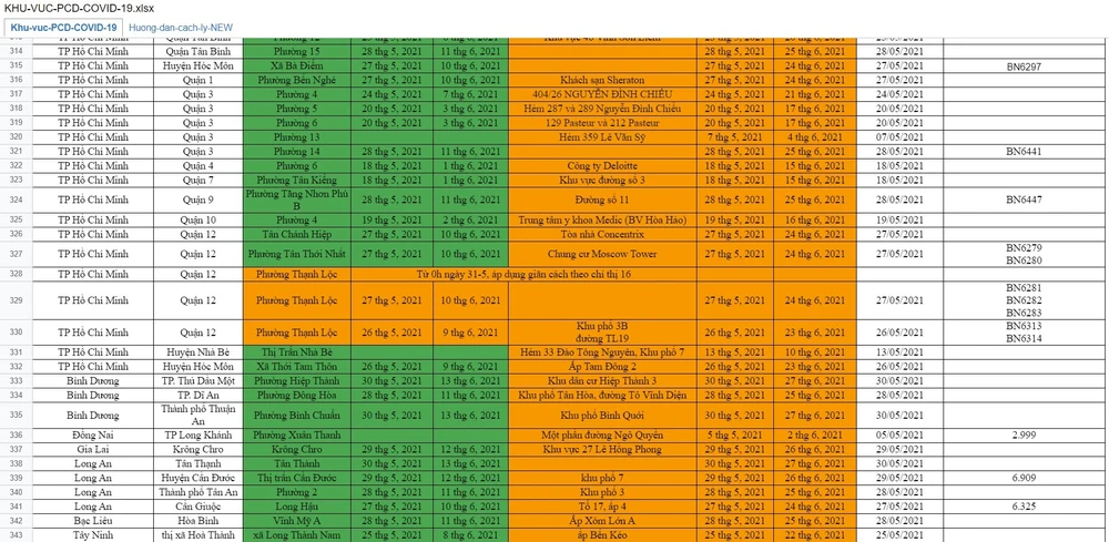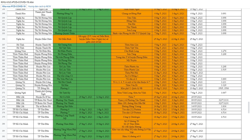 Bảng dưới đây là quy định áp dụng biện pháp phòng, chống dịch COVID-19 đối với các trường hợp về, đến Đà Nẵng từ TP.Hồ Chí Minh. Lưu ý, khu vực màu cam áp dụng biện pháp cách ly y tế tập trung và lấy mẫu xét nghiệm 4 lần; màu xanh thực hiện cách ly y tế tại nhà và lấy mẫu xét nghiệm 4 lần theo quy định.