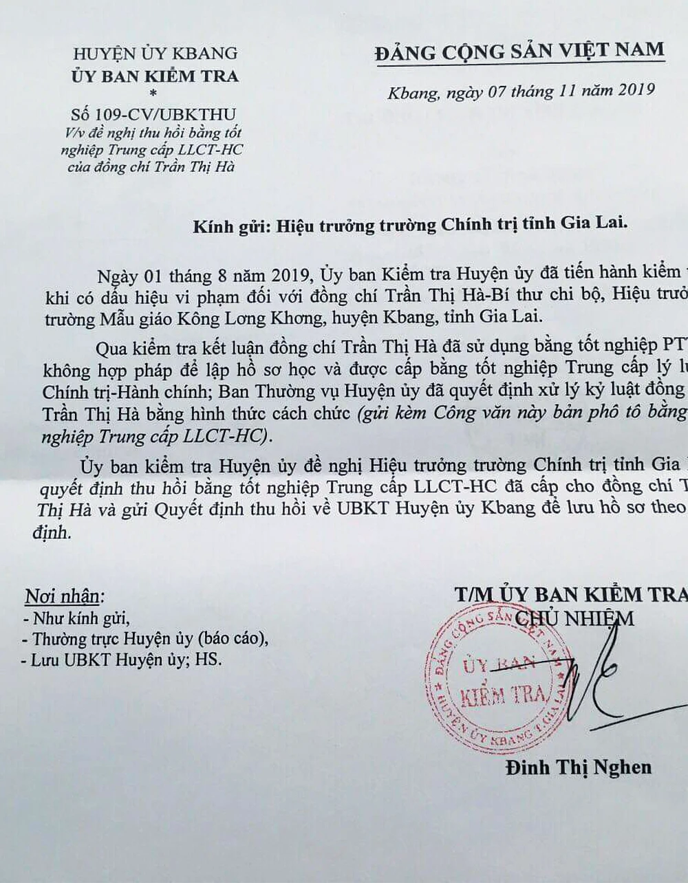 Cũng từ kết quả trên, vào ngày 13-11-2019, TS Nguyễn Thái Bình - Hiệu trưởng Trường Chính trị tỉnh Gia Lai, đã ký quyết định thu hồi bằng tốt nghiệp Trung cấp lý luận Chính trị - Hành chính của bà này theo đề nghị của UBKT Huyện ủy Kbang.