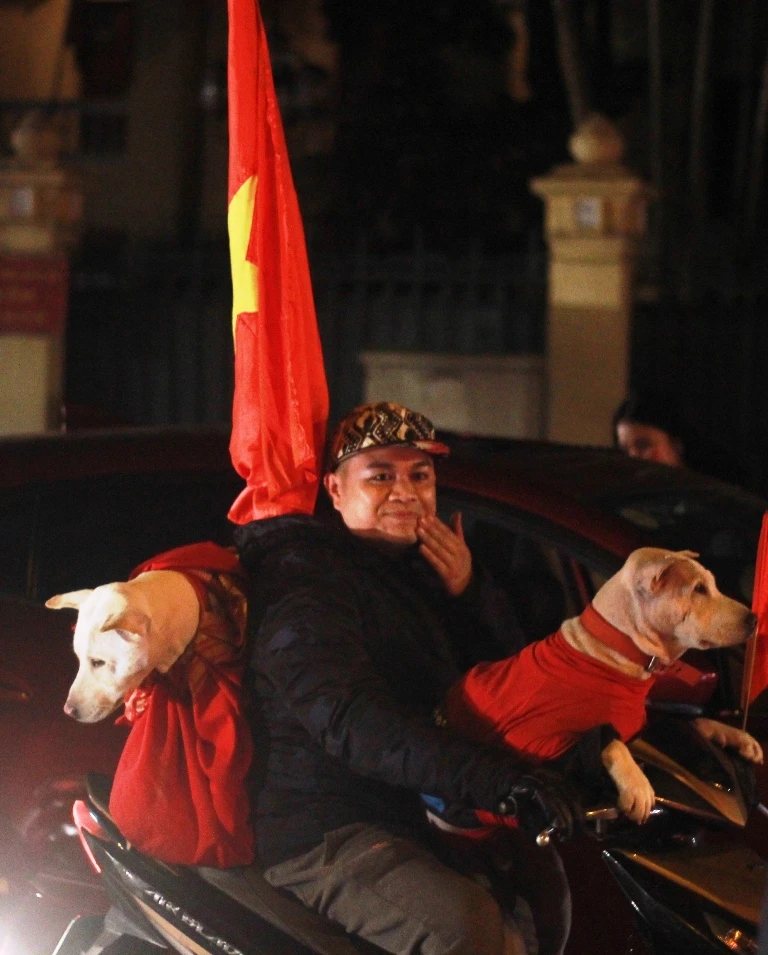 Đặc biệt là những công nhân môi trường. Tan ca làm việc sau chiến thắng của đội tuyển, họ "đi bão" ngay trên chiếc xe quen thuộc của mình hòa vào dòng người.