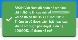 Gửi hồ sơ thay đổi thông tin thành công, hệ thống hiển thị thông báo như hình dưới: