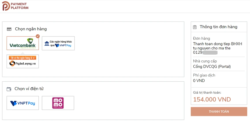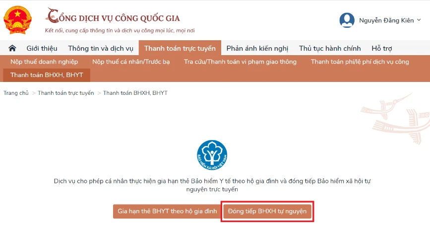 Dịch vụ thanh toán trực tuyến Đóng tiếp BHXH tự nguyện