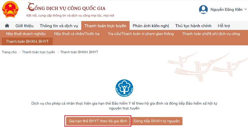 Dịch vụ thanh toán trực tuyến Gia hạn thẻ BHYT theo hộ gia đình