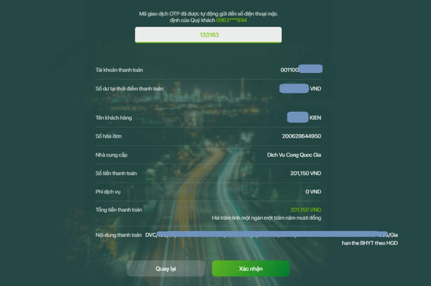 Các thao tác trên giao diện Internet Banking của Ngân hàng bạn thực hiện tương tự như các Bước 6, 7, 8 ở dịch vụ thanh toán Gia hạn thẻ BHYT theo hộ gia đình.