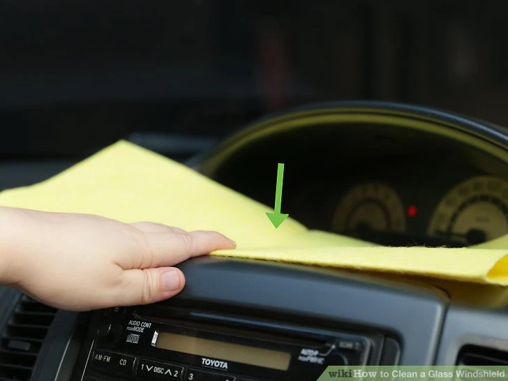Đặt một khăn sạch lên trên bảng điều khiển: Điều này sẽ giúp ngăn chặn bụi bẩn hoặc nước nhỏ xuống bảng điều khiển trong quá trình bạn lau kính chắn gió.