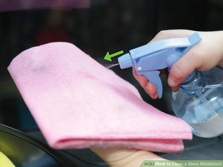 Xịt 1 ít nước rửa kính lên miếng vải trước khi tiến hành lau. Ảnh: wikiHow