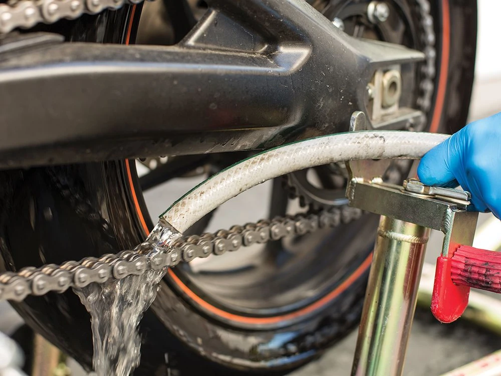 Xịt nước vào xích để rửa sạch lại xích. Ảnh: Motorcyclist