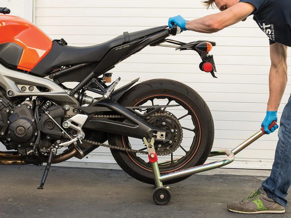 Đặt bánh sau của xe lên giá đỡ. Ảnh: Motorcyclist