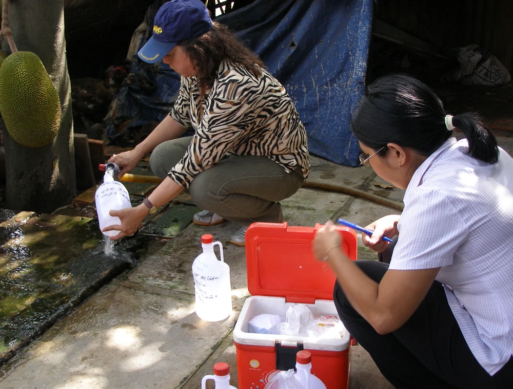 Trung tâm Y tế dự phòng TP.HCM có thực hiện xét nghiệm mẫu nước giếng khoan. Muốn xét nghiệm chỉ tiêu vi sinh có thể dùng chai nước suối 0,5 lít còn nguyên màng co. Trước khi lấy mẫu phải rửa tay sạch và sát trùng bằng cồn. Sau đó dùng bông gòn tẩm cồn hơ lửa xung quanh vòi lấy nước. Tiếp theo mở màng co, mở nắp chai và đổ hết nước trong chai ra (lưu ý không để bàn tay chạm vào miệng chai). Tráng chai 2-3 lần bằng nguồn nước lấy mẫu rồi hứng 2/3 chai và đậy ngay nắp.