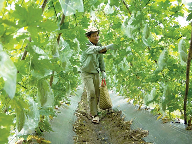 Những trái khổ qua được trồng theo phương pháp sạch, mỗi quả được bọc nilon sạch sẽ bên ngoài