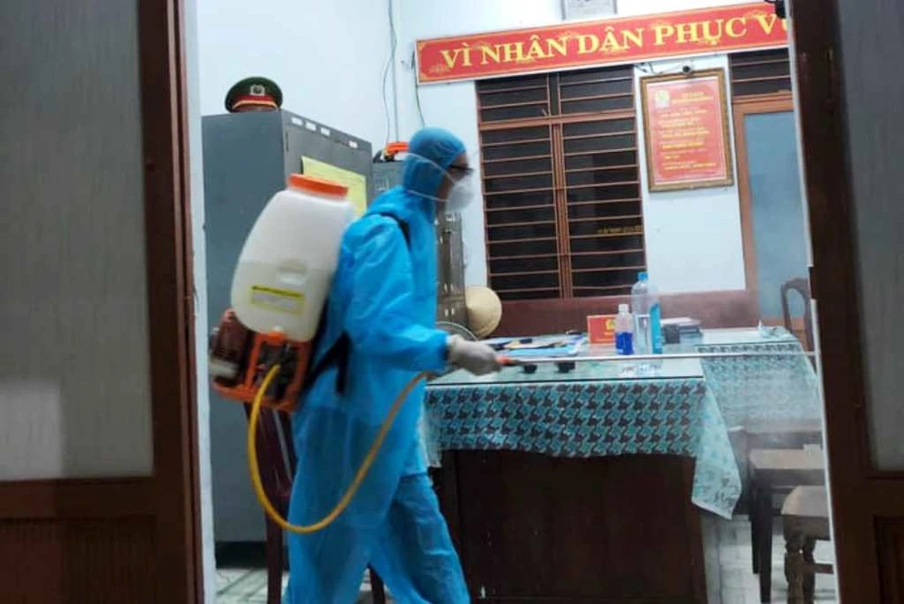 Phun thuốc khử trùng trụ sở Công an phường Nại Hiên Đông. Ảnh: Công an cung cấp