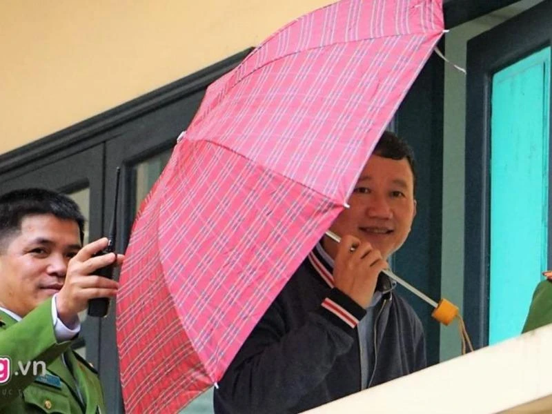 Bị cáo Trịnh Xuân Thanh được che dù đưa về phòng chờ để nghỉ trưa. Ảnh: Zing